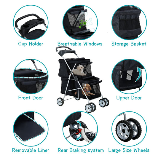 Double Pet Strollers for 2 Dogs and Cats 4 Wheel Doggie Small Medium Pets with Safety Belts Folding Portable Dog Cat Storage Basket Travel Jogger (Black), 30 X 19 40 Inch