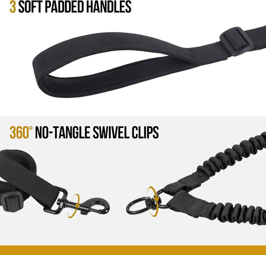 Dual Dog Leash, Double Dog Leash, Double Dog Walking & Training Leash, Comfortable Shock Absorbing Bungee for Two Dogs, Medium Large(Black)